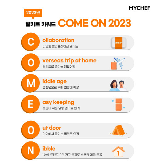 식품산업통계정보는 국내 밀키트 시장이 2020년 1,882억 원 규모에서 2025년 7,253억 원 규모로 성장할 것으로 내다봤다. 밀키트를 구매하는 20대는 감바스, 마라탕, 파스타 등 다양한 제품에 관심을 가지며, 30~40대는 홈파티, 캠핑, 집들이 등 가족 또는 친지와 즐기는 제품을 찾으며, 40대는 요리놀이터 등 자녀와 같이 만들어 먹을 수 있는 제품에 관심이 있는 것으로 나타났다.