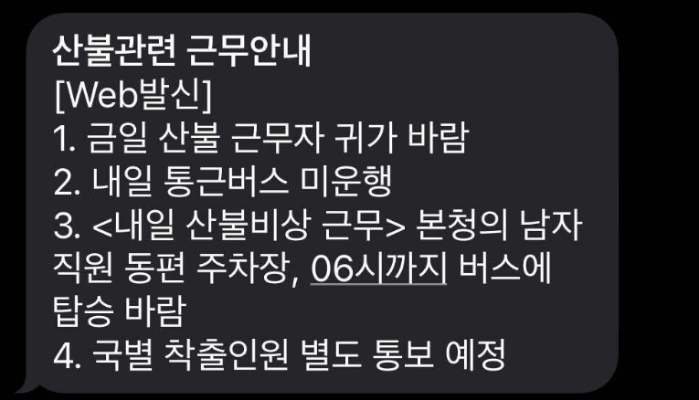 A씨가 올린 게시물에는 “내일 산불비상근무에 본청의 남자 직원만 주차장으로 오전 6시까지 버스에 탑승바란다. 부서별 착출인원은 별도로 통보할 예정이다”는 내용의 문자메시지가 캡처돼 첨부됐다.