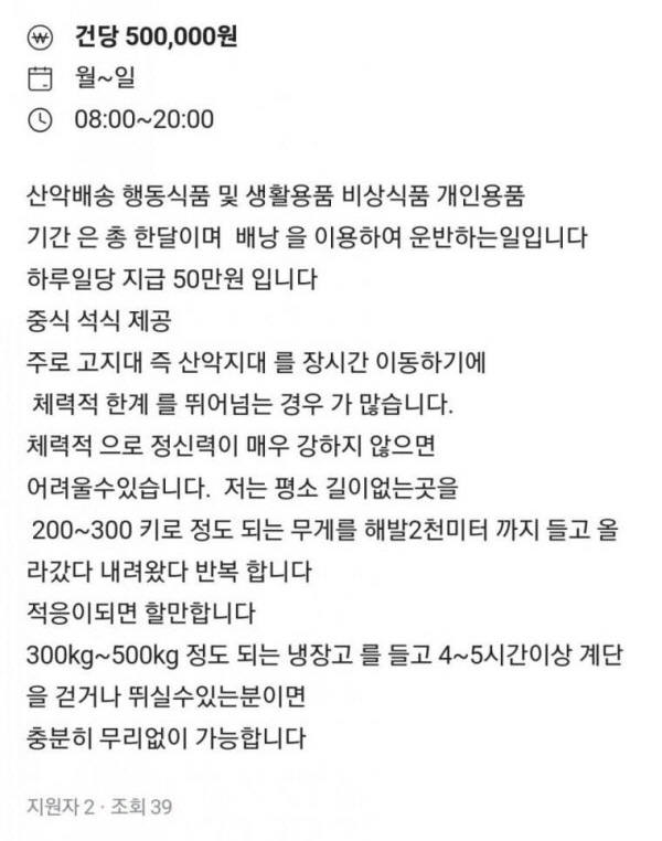 해당 글을 본 누리꾼들은 “300kg~500kg 되는 물건을 들고 4~5시간 이상 계단을 걷거나 뛸 수 있는 사람이 있긴 하나”라며 허탈함을 감추지 못했다.