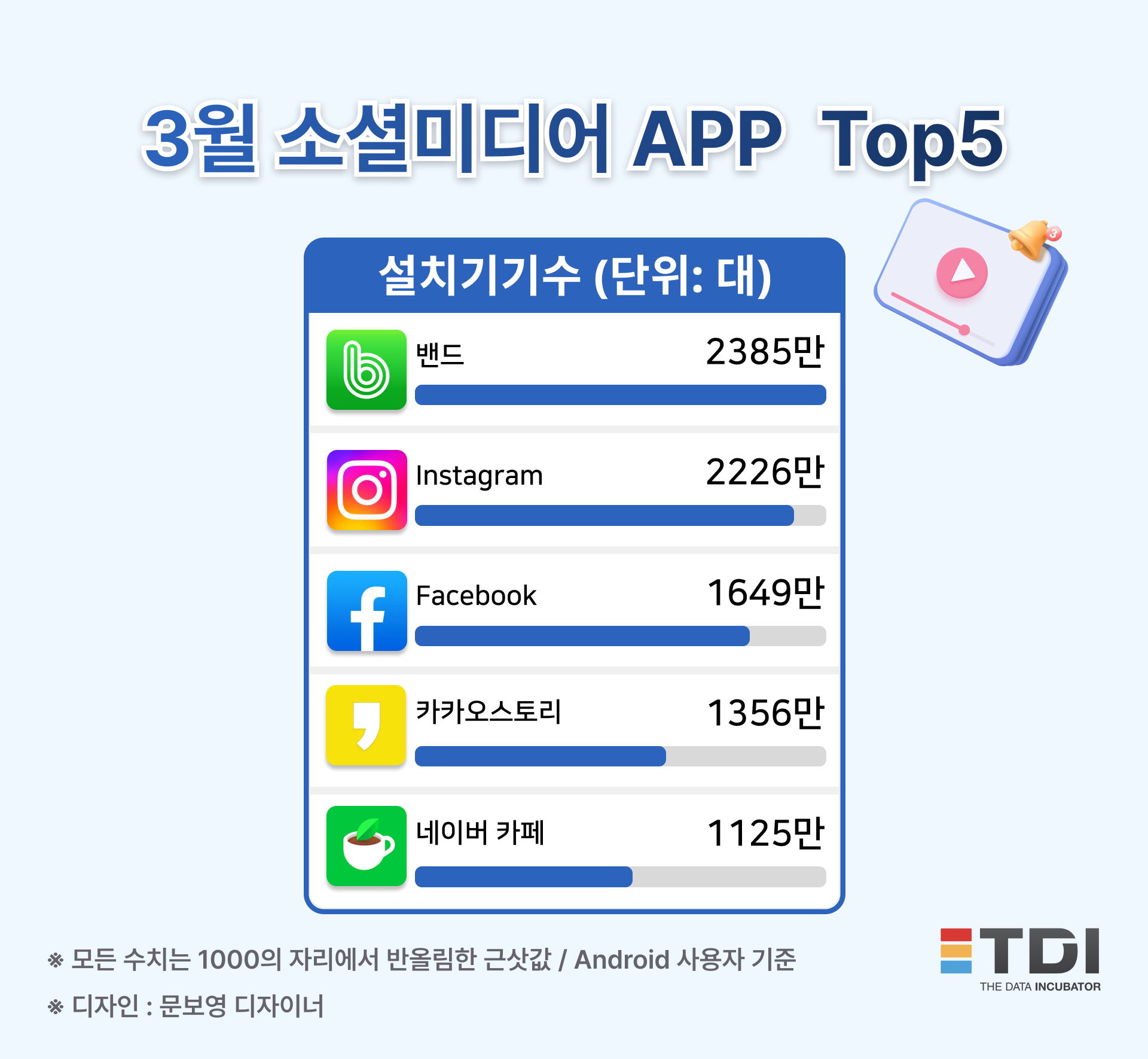 3월 기준 소셜미디어 톱5는 △밴드(2,385만 대) △Instagram(2,226만 대) △Facebook(1,649만 대) △카카오스토리(1,356만 대) △네이버 카페(1,125만 대)다.