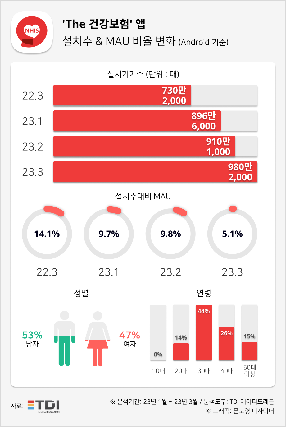 빅데이터 전문 기업 TDI(티디아이, 대표 신성균)가 자사의 분석 플랫폼 데이터드래곤을 통해 안드로이드 사용자가 설치한 ‘The 건강보험’의 기기 설치 수와 대비 월간 활성화 이용자 수(MAU)를 분석해 봤다.