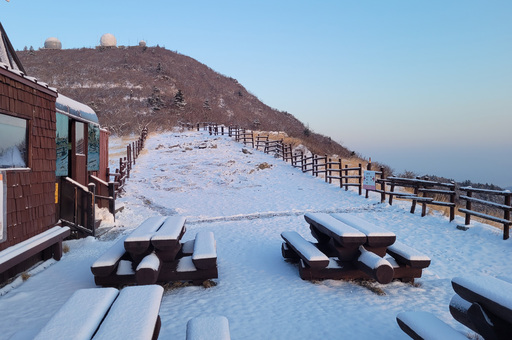 17일 전국 대부분의 지역에서 평년 수준의 포근한 날씨를 보인 가운데, 강원 설악산 중청대피소 일대에 때아닌 눈이 내려 쌓여 있다. 이 지역은 전날 오후부터 이날 오전까지 대설주의보가 발효됐다. 부산에는 지난 16일 대기 불안정으로 우박이 내리기도 했다. 기상청은 18일 전국 대부분 지역에서 돌풍과 함께 천둥·번개를 동반한 비가 내릴 것으로 예보했다.