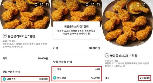 최근 냉동과 냉장 선택이 생긴 메뉴는 날개 부위의 부분육을 사용하는 '핫윙'으로, 기본 냉동육은 2만원이고 냉장육으로 변경할 경우 3000원의 추가 요금이 붙는다.