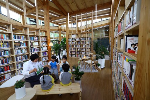 2일 서울 성북구 오동근린공원에 문을 연 책쉼터에서 어린이들이 둘러앉아 구연동화를 듣고 있다. 오동근린공원 책쉼터는 지상 1층, 연면적 428㎡ 규모의 목제 건축물로 북카페, 다목적 공간, 휴게데크 등으로 이뤄졌다. 서울시와 성북구는 개관일부터 가족과 어린이 등을 위한 다양한 체험 프로그램을 무료로 운영한다.