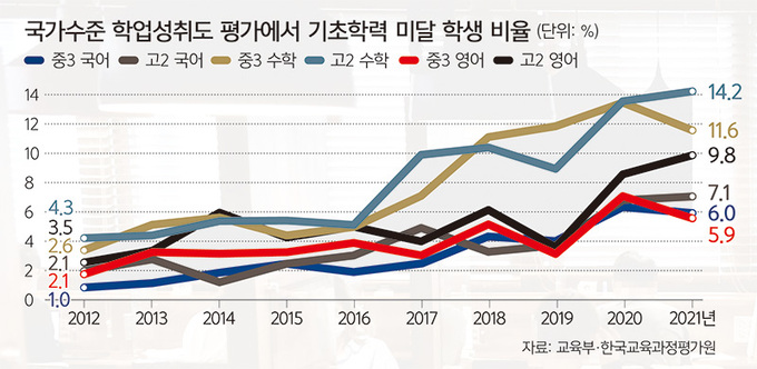 코로나19 이후 기초학력 미달 학생이 증가한 것은 틀림없는 사실입니다. 국가수준 학업성취도 평가를 주관하는 한국교육과정평가원에 따르면 코로나19 이전인 2019년 기초학력 미달학생은 중3의 경우 국어 4.1%, 수학 11.8%, 영어 3.3%였고 고2는 국어 4.0%, 수학 9.0%, 영어 3.6%였습니다. 하지만 코로나19 2년 차인 2021년에는 0.2%포인트 줄어든 중3 수학을 제외하고 2년 전보다 적게는 1.9%포인트(중3 국어)에서 많게는 6.2%포인트(고2 영어)까지 크게 늘었습니다. 특히 고2 학생 7명 중 1명은 수학 교과에서 기초학력에 미달한다는 결과가 충격적입니다.