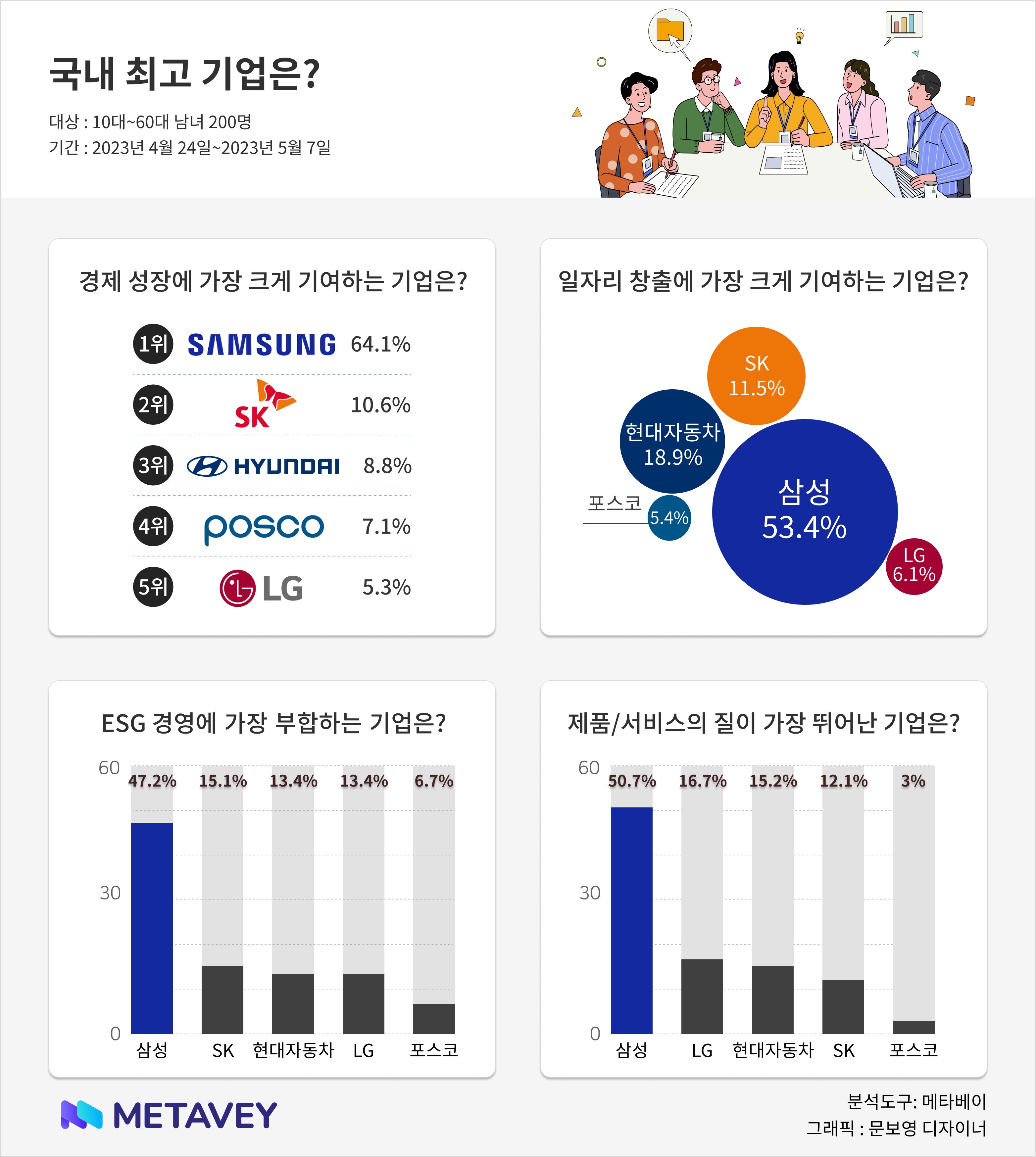 우선 ‘경제 성장에 가장 크게 기여하는 기업은 어느 곳입니까?’라는 질문에 조사 참여자들의 64.1%가 삼성을 꼽았고 △SK 10.6% △현대자동차 8.8% △포스코 7.1% △LG 5.3% 순으로 나타났다.