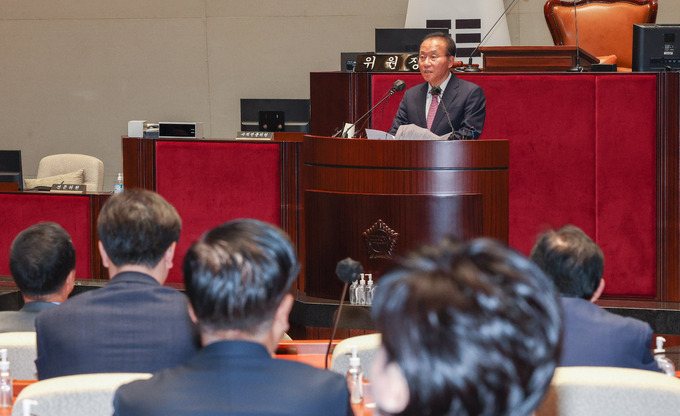 국민의힘 윤재옥 원내대표가 25일 서울 여의도 국회에서 열린 의원총회에서 모두발언을 하고 있다.