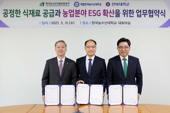 한국농수산식품유통공사(사장 김춘진)는 31일 전주 한국농수산대학교에서 전북대학교(총장 양오봉), 한국농수산대학교(총장 정현출)와 함께 공공급식통합플랫폼을 통한 지역 먹거리 제공과 저탄소 식생활 확산을 위한 3자 업무협약을 체결했다.
