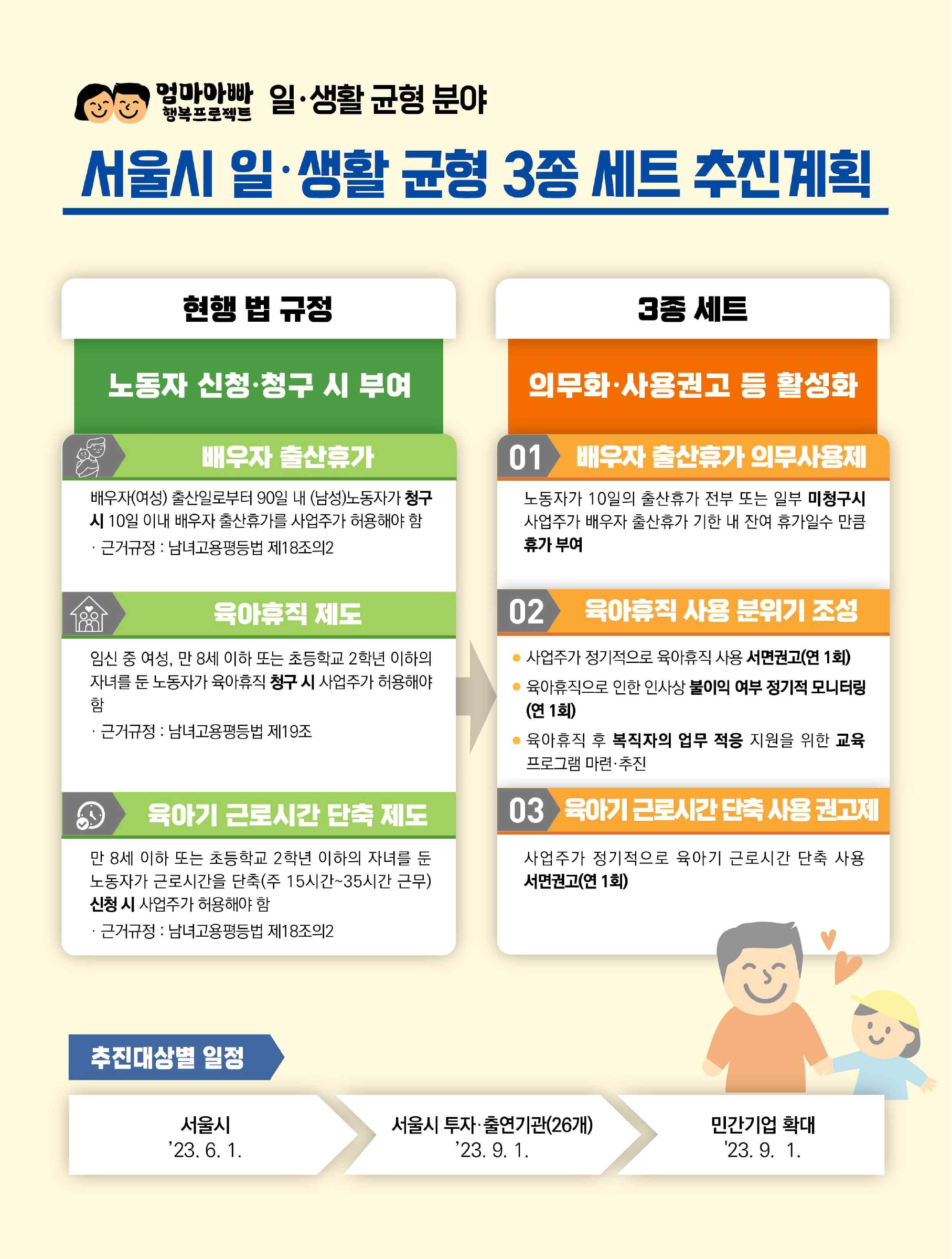 시는 이 3종 세트를 통해 법적으로 보장된 제도부터 활성화한 후 새로운 제도를 계속 찾아 추진해나갈 계획이다. 각종 법령·규정에 산발적으로 흩어져 있어 신청방법이나 절차가 명확하지 않은 일·생활 균형 관련 제도를 하나로 묶은 ‘서울형 일·생활 균형 표준규정’을 하반기 중에 마련한다. 동참하고자 하는 민간기업엔 무료 컨설팅을 지원한다.