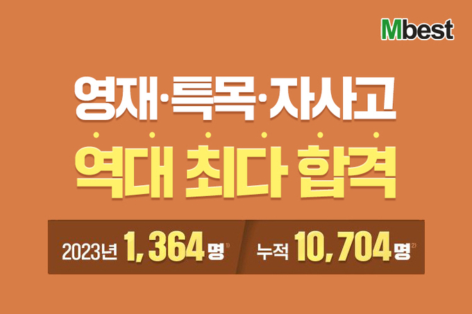 메가스터디교육이 만든 중등 인강 엠베스트가 2023학년도 특목고‧자사고 합격생 총 1,364명을 배출하며 역대 최다 기록을 경신했다. 2012학년도부터 2023학년도까지 영재‧특목‧자사고 누적 합격생은 1만 704명에 달한다.