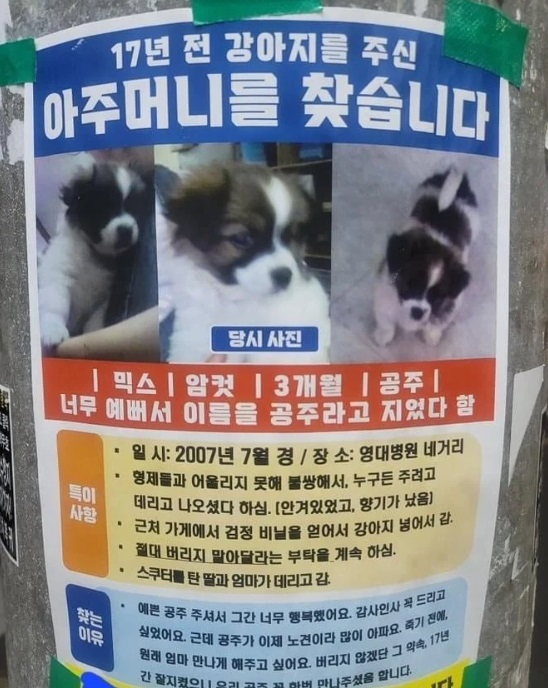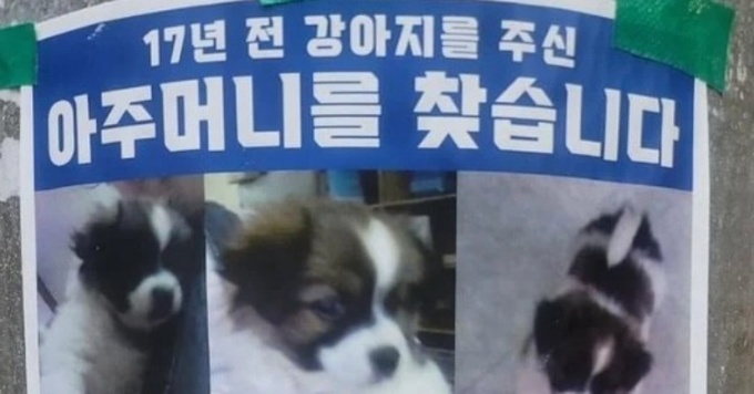 8일 한 온라인 커뮤니티에는 ‘강아지를 주신 아주머니를 찾습니다’라는 글이 올라왔다. 글에는 특별한 내용 없이 ‘17년 전 강아지 주신 아주머지 찾아요’라는 제목의 전단지 사진이 첨부됐다.