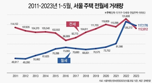 부동산 정보제공업체 경제만랩은 서울부동산정보광장을 통해 지난 1∼5월 서울 주택(단독·다가구·다세대·연립주택·아파트) 전·월세 거래량 22만9천788건을 들여다본 결과, 전세 11만2천612건, 월세 11만7천176건으로 월세 비중이 51%를 차지했다고 21일 밝혔다.