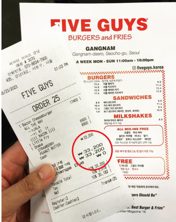 한 소비자가 파이브가이즈에 들린 기념으로 영수증 인증 사진을 온라인 커뮤니티에 올렸는데 베이컨 치즈버거 1만7400원, 제일 작은 용량의 감자튀김 6900원, 셰이크 8900원 등 총 3만3200원을 결제했다.
