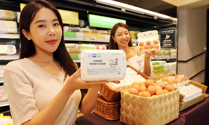 모델들이 9일 신세계백화점 강남점 식품매장에서 건강한 닭이 낳은 ‘자연방사 유정란’을 선보이고 있다. 자연방사 유정란은 오탄농장의 김구봉 대표와 협업해 무항생제, 동물복지(국내1호) 등을 인증받은 신선한 계란이다.
