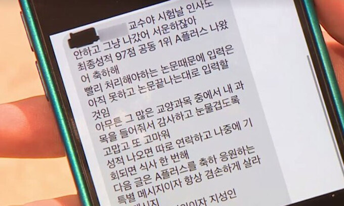 문자 내용을 보면 A씨는 “OOO 교수야. 시험날 인사도 안 하고 그냥 나갔어. 서운하잖아. 최종 성적 97점 공동 1위로 A+ 나왔어. 축하해”라며 “빨리 처리해야 하는 논문 때문에 (성적)입력은 논문 끝나는대로 할 거야”라며 성적을 입력도 하기 전에 축하메시지를 보냈다.