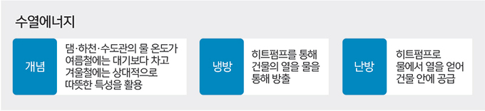 수열에너지는 댐·하천이나 수도관의 물 온도가 여름에는 바깥보다 차고 겨울에는 따뜻한 현상을 이용한다. 취수장의 경우 한여름에는 바깥 온도가 8.8도 높고, 한겨울에는 9.1도나 낮다. 물을 열원으로 삼아 히트펌프를 이용해 냉난방을 하게 된다.