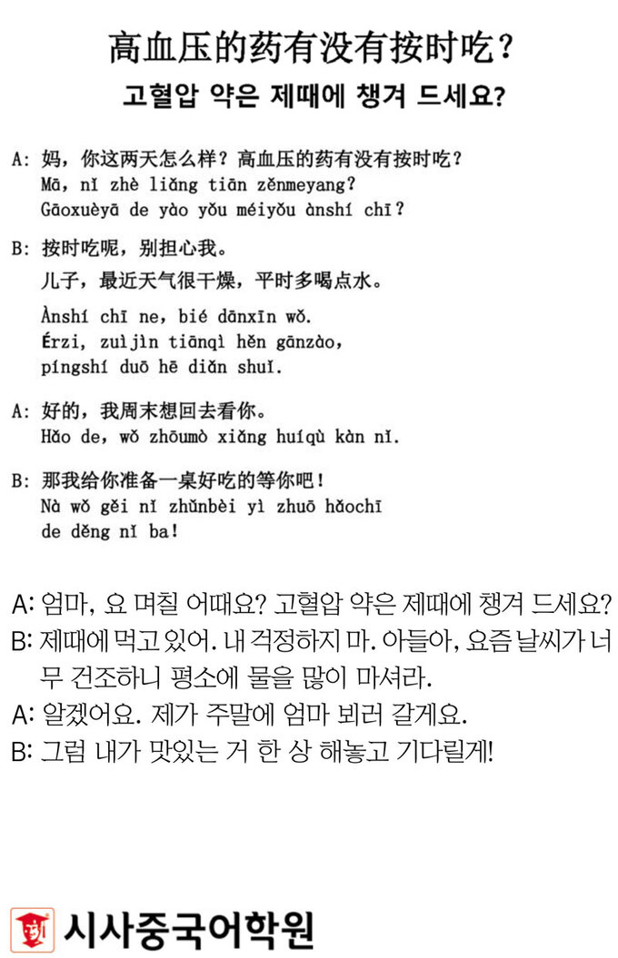 [시사중국어학원의 리얼 중국어 회화] 고혈압 약은 제때에 챙겨 드세요?