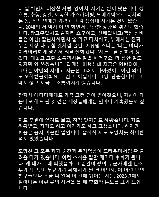 나아가 “잡지사 에디터에게도 가끔 그런 일이 벌어졌으니, 자신이 마음대로 해도 될 것 같은 대상들에게는 얼마나 가혹했을까 싶다”고 피해자들을 언급했다.