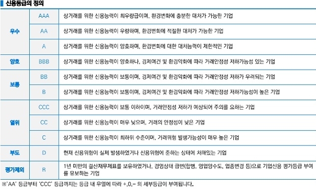 한편 기업 신용등급 평가는 최우수 단계인 AAA 단계부터 평가제외 단계인 R 단계까지 세분화되어 관리되고 있으며, 민간 기업간 거래뿐만 아니라 적격심사 등 관공사 입찰 등에도 활용되고 있다.