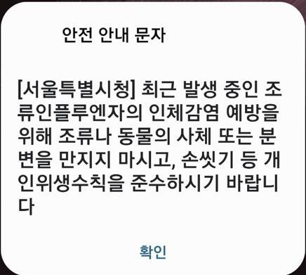 서울시는 이날 오후 4시 28분께 안전 안내 문자를 통해 "조류인플루엔자의 인체 감염 예방을 위해 동물의 사체 또는 분변을 만지지 말고, 손씻기 등 개인 위생수칙을 준수해달라"고 요청했다.
