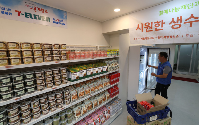 1일 서울 용산구 동자동 쪽방촌에 편리하게 생필품 지원을 받을 수 있는 매장 동행스토어 '온기창고'에서 관계자들이 다음날 본격적인 매장 운영을 앞두고 물품을 정리하고 있다. 온기창고는 8월부터 월, 수, 금 주 3일 운영한다. 서울시는 줄서기 방식을 없애고 쪽방촌 주민들이 개인이 배정받은 적립금 한도 내에서 후원받은 생필품을 자율적으로 선택해 수령할 수 있도록 사업을 추진하게 됐다.