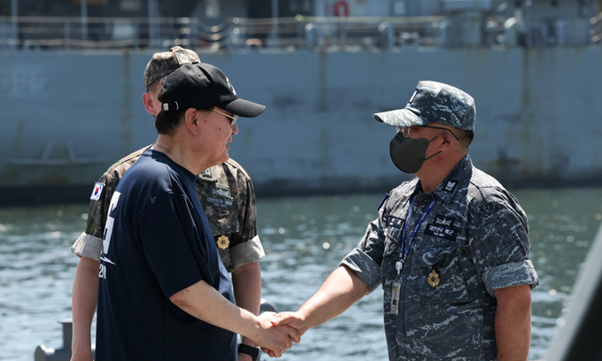 윤석열 대통령이 여름휴가 이틀째인 3일 초계함 천안함을 상징하는 ‘PCC-772’ 문구가 새겨진 모자와 티셔츠를 착용하고 경남 진해 해군기지 내 군항을 찾아 장병들을 격려하고 있다. 윤 대통령은 오는 8일까지의 휴가 동안 전통시장 등 전국 민생 현장을 방문하고, 부인 김건희 여사와 경남 거제 저도에서 휴식을 취할 예정이다.