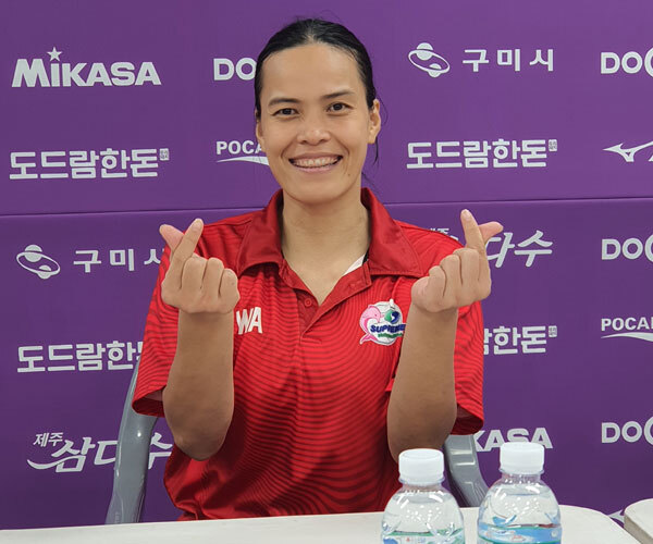 수훈 선수로 인터뷰실에서 들어선 아피냐퐁은 “한국에서 대회를 뛰게 해줘서 영광스럽다. 한국의 V리그는 태국 팬층도 두텁다. 항상 지켜보기만 했던 팀들과 경기해서 좋았다”라고 말했다.