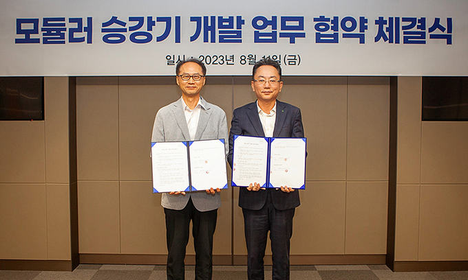 양사는 이날 서울 강동구 상일동 삼성 글로벌 엔지니어링센터에서 양해각서 체결식을 열고 연내 모듈러 공법 전용 엘리베이터 개발에 나서기로 했다.