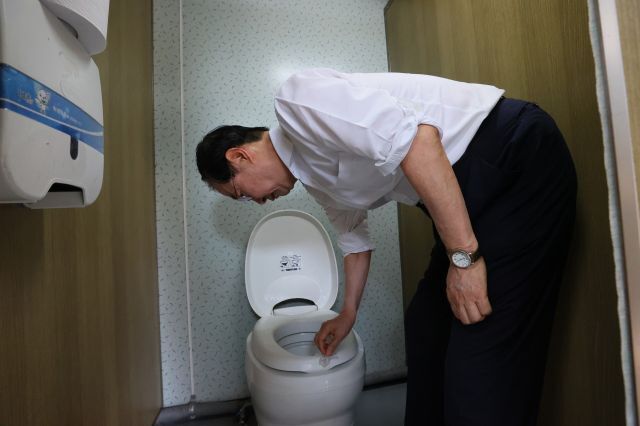 한덕수 국무총리가 지난 4일 오후 전북 부안군에서 열리고 있는 2023 새만금 세계스카우트잼버리 대회장을 찾아 화장실을 점검하고 있다. 연합뉴스