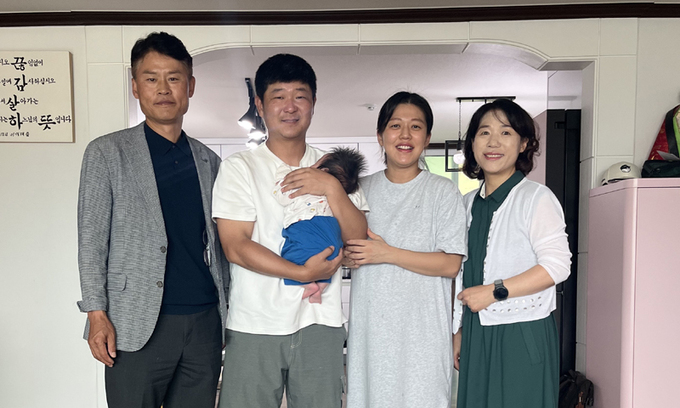 기쁜 소식을 전해들은 평창군 직원들은 이날 한달음에 달려갔다. 출산용품으로 구성된 축하박스와 제철 과일 등을 전달하고 아빠 품에 안긴 아기와도 눈을 맞췄다.