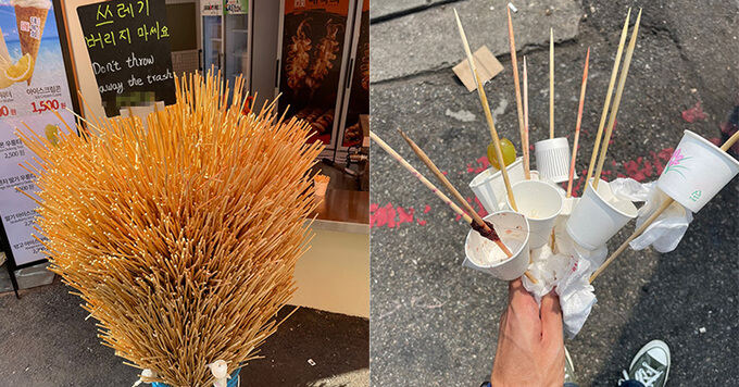 먹다가 흘린 탕후루도 골칫거리였다. 이날 기온은 섭씨 33도로 매우 덥고 습한 날씨였다. 바닥에 떨어진 탕후루에 금방 벌레가 꼬이기 시작했다. 탕후루 판매점 앞에는 꼬치를 버릴 수 있는 통이 있었다. 안내 문구와 함께 엄청난 양의 꼬치가 꽂혀있었다. 회수통이 있음에도 거리에 버려진 탕후루 꼬치를 보니 씁쓸했다.