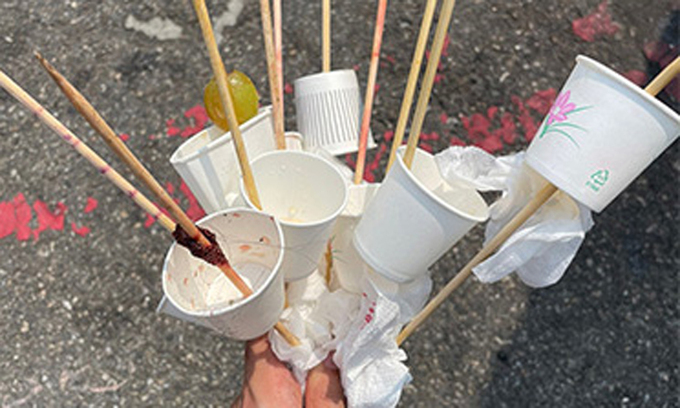 탕후루가 판매되기 시작하고 약 1시간가량 일대를 걸어 다니며 탕후루 쓰레기를 주워봤다. 탕후루 쓰레기는 거리 곳곳에서 발견됐다. 오전에 걸었을 때는 없던 쓰레기가 금방 눈에 띄었다. 쓰레기를 주우면서 느낀 점은 꼬치를 처리하기가 상당히 까다롭다는 점이다. 쓰레기봉투를 뚫고 나온 탕후루 꼬치가 마치 고슴도치 가시 같았다. 또 꼬치를 부러뜨려 버리기도 번거로워서인지 봉투 위에 얹어놓은 모습이 대부분이었다.