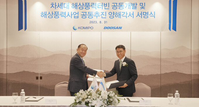 두산에너빌리티는 31일 한국중부발전과 차세대 해상풍력 공동개발 및 해상풍력사업 추진을 위한 양해각서(MOU)를 체결했다. 이날 서명식에는 한국중부발전 김호빈 사장과 두산에너빌리티 정연인 사장 등 양사 관계자들이 참석했다.
