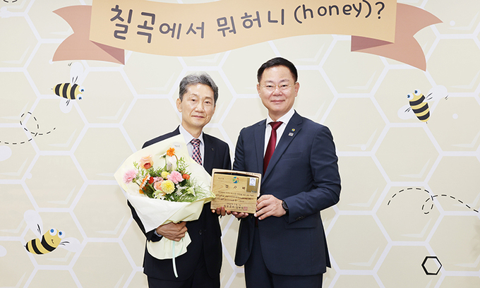 칠곡군은 박 대표에게 고마운 마음을 담아 칠곡에서 생산한 나무로 만든 감사패를 전달했다.