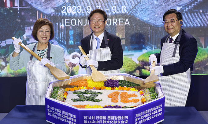 박보균 문화체육관광부 장관(가운데)과 나가오카 게이코 일본 문부과학상(왼쪽), 후허핑 중국 문화여유부장이 지난 7일 전주 국립무형유산원에서 시작한 ‘제14회 한·중·일 문화장관회의’에 앞서 3국 간 우정과 협력의 메시지를 담은 비빔밥 퍼포먼스를 하고 있다. 3국 장관은 8일 끝난 회의에서 미래세대와 지역 간 교류를 강화하고 문화콘텐츠 산업의 경쟁력 확보를 위해 긴밀히 협력한다는 내용의 ‘2023 전주 선언문’을 공동으로 채택했다. 3국 장관이 한자리에서 만난 건 코로나19 이후 4년 만이다.