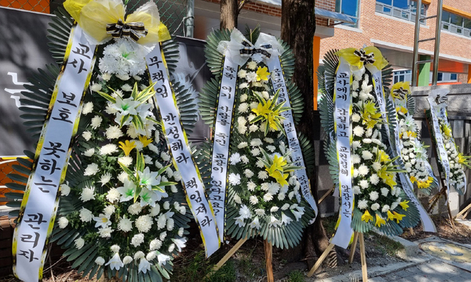 근조화환에는 ‘교권보호위원회 안 열어준 무책임한 교장’, ‘교사 죽음 방관한 교장’, ‘교사에게 갑질하고 교권 침해 앞장서는 이기적인 보신주의 관리자는 물러가라’, ‘교사 인권을 짓밟은 관리자’, ‘똑똑, 여기 사람을 죽인 교장이 있다고요?’ 등의 문구 적혔다. ‘관리자는 학부모만 관리하느냐’, ‘교권보호위원회는 교사의 권리다’, ‘동료 교사’ 등 내용이 포함된 것으로 미뤄 대부분 교사가 보낸 것으로 추정된다.