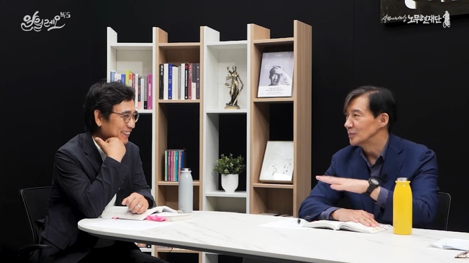 이날 본격적으로 이야기에 들어가기 전 조 전 장관 소개 차례에서 나온 ‘교수’ 직함에 유 전 이사장이 “학교에서 잘려서 소송을 하고는 있지만 학생을 안 가르치니 교수가 아니다”라고 말하자, 조 전 장관은 “그렇다”며 고개를 끄덕였다.