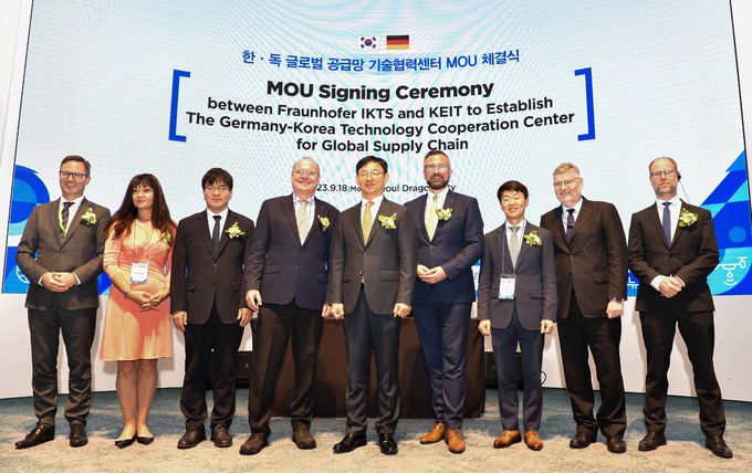 한국산업기술평가관리원(KEIT)이 18일 서울 용산구 드래곤시티에서 독일 프라운호퍼 IKTS 연구소와 한-독 공급망 센터 설립을 위한 업무협약을 체결했다. KEIT와 프라운호터 IKTS연구소는 기술협력센터를 설립하고 차세대 반도체와 미래 자동차 산업부문의 기술 협력 수요를 발굴할 예정이다.