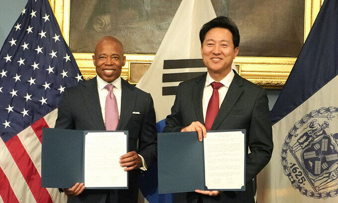 북미 출장 중인 오세훈 서울시장은 18일(현지시간) 미국 뉴욕시청에서 에릭 애덤스 뉴욕시장과 면담하고 친선도시 양해각서(MOU)를 체결했다.