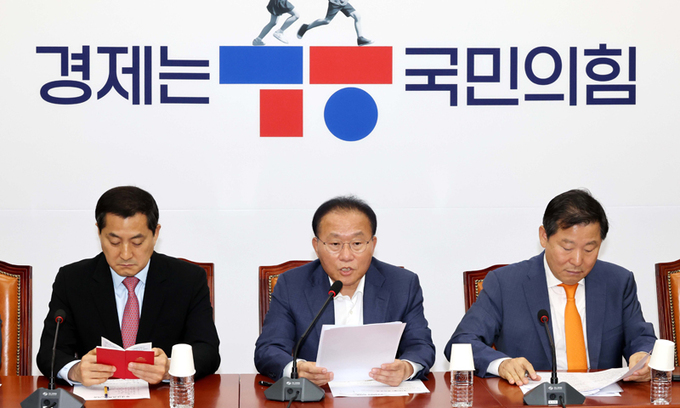 국민의힘 윤재옥 원내대표(가운데)가 19일 서울 여의도 국회에서 열린 원내대책회의에서 발언하고 있다. 윤 원내대표는 단식 중인 더불어민주당 이재명 대표의 체포동의안 표결과 관련해 “민주당은 국민께서 던지는 싸늘한 눈길을 염두에 두고 체포동의안 표결에 임하라”고 촉구했다.