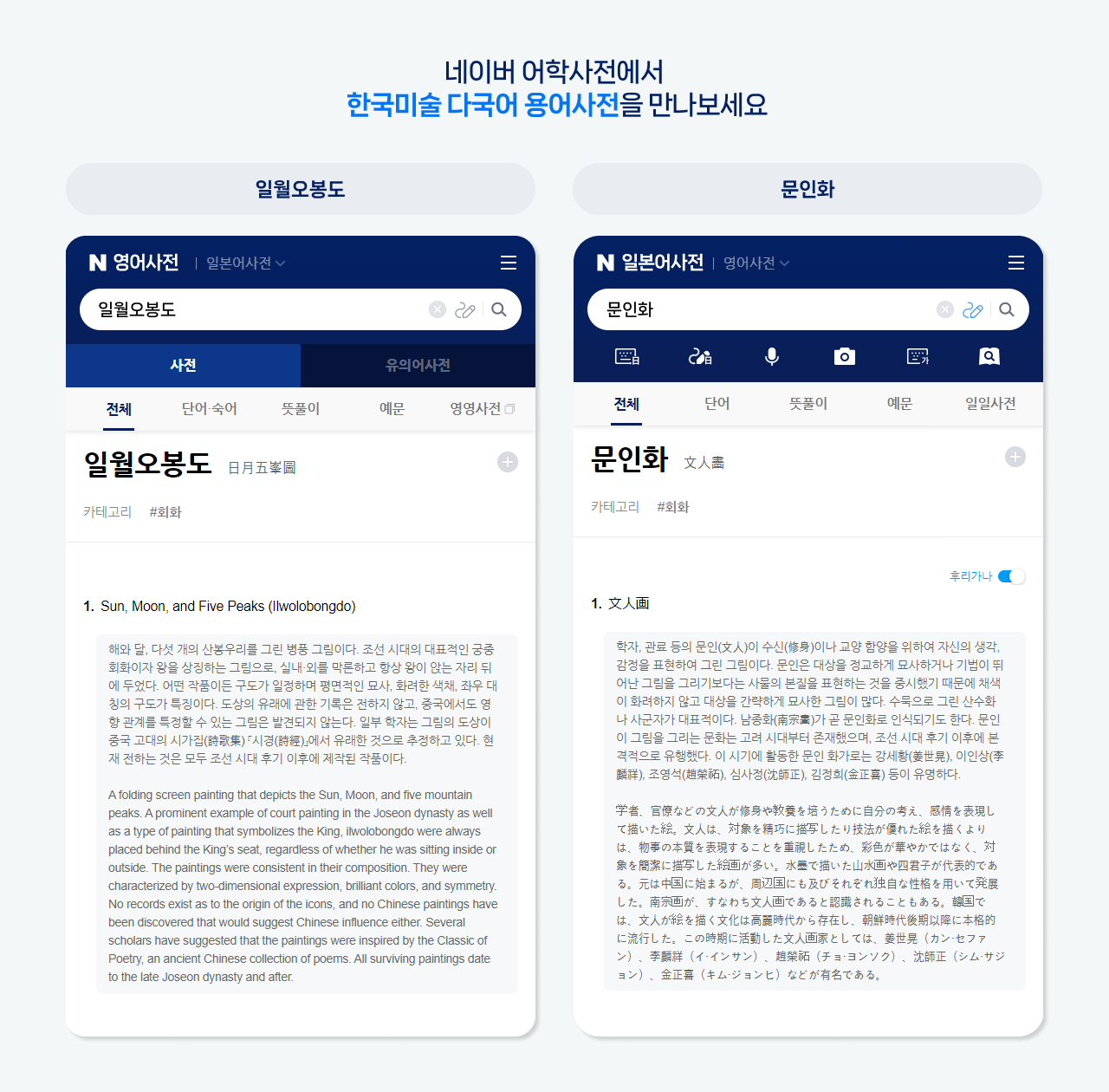 더 많은 이용자들이 미술 관련 용어를 쉽게 이해하고 활용할 수 있도록, 네이버와 예술경영지원센터는 지난 7월 ‘한국미술 다국어 용어사전의 대국민 서비스 확대’를 위한 업무협약을 체결했다. 이제 네이버 어학사전에서 ‘문인화’, ‘일월오봉도’ 등 6천여 개의 미술 용어를 정확한 다국어 표기와 함께 만나볼 수 있다. 용어에 대한 자세한 개념도 제공하기에, 미술 작품을 감상하거나 관련 연구를 진행할 때 한층 유용할 것으로 기대된다. 아울러, 한국 문화에 관심을 갖고 있는 글로벌 이용자들도 네이버 어학사전을 활용해 한국 미술에 대한 이해를 높일 수 있다.