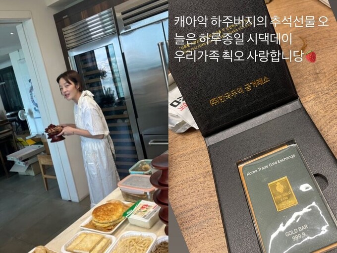 공개한 사진에는 포장 박스에 잘 담긴 골드바와 시댁에서 제사를 준비 중인 것으로 보이는 황보라의 모습이 담겼다.