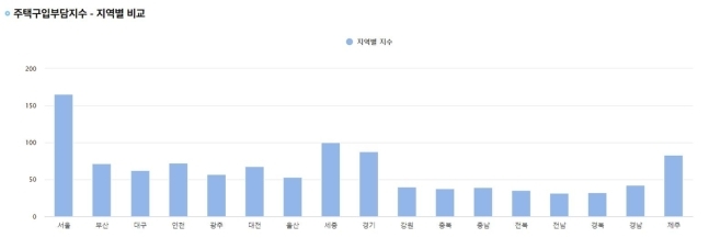 지역별로 보면 서울의 주택구입부담지수는 2분기 165.2로 1분기(175.5) 대비 10.3p 하락했다.