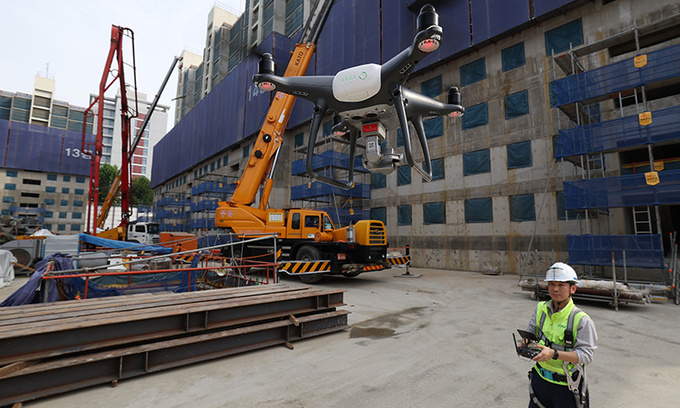 지난 12일 오후 2시 서울 강동구 둔촌현대1차 리모델링 공사현장. 내년 10월 입주 예정으로 철근·콘크리트 작업과 마감재 공사가 한창 진행 중인 가운데 드론 한 대가 아파트 사이를 누비며 바쁘게 날고 있다. 가로, 세로 각 29㎝, 무게 1.4㎏의 소형 드론이지만, 4K 화질의 2000만 화소급 카메라가 탑재돼 현장 곳곳의 공사상황을 촬영할 수 있다.