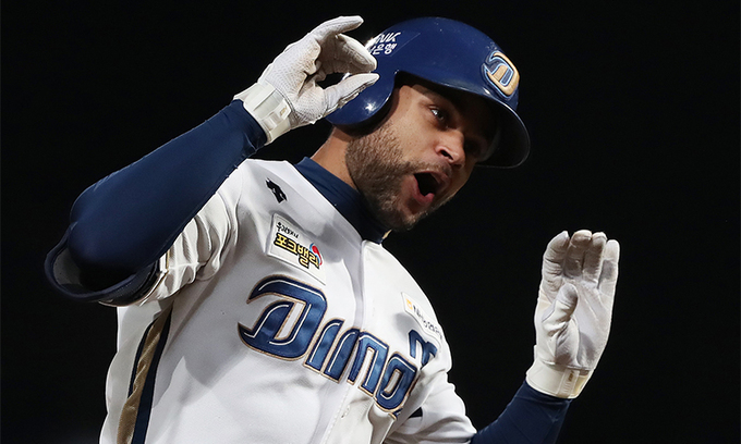 NC 제이슨 마틴이 25일 경남 창원 NC파크에서 열린 준플레이오프 3차전에서 역전 3점 홈런을 터트린 뒤 포효하고 있다.
