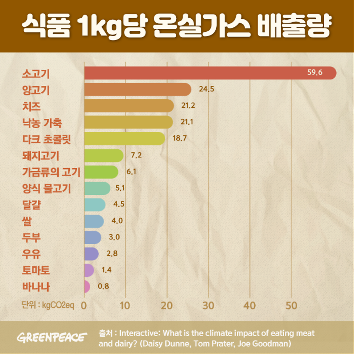 그린피스는 식품 종류에 따라 배출되는 온실가스 배출량을 공개했는데요. 그중 소고기, 양고기, 치즈와 같은 축산업과 낙농업에서 배출되는 탄소의 양이 가장 많았다고 합니다. 그중 소고기가 압도적으로 높은데요. 소를 키우기 위해 숲을 태우고, 사료를 만드는 과정에서 많은 온실가스가 배출되기 때문이라고 그린피스는 전했습니다.