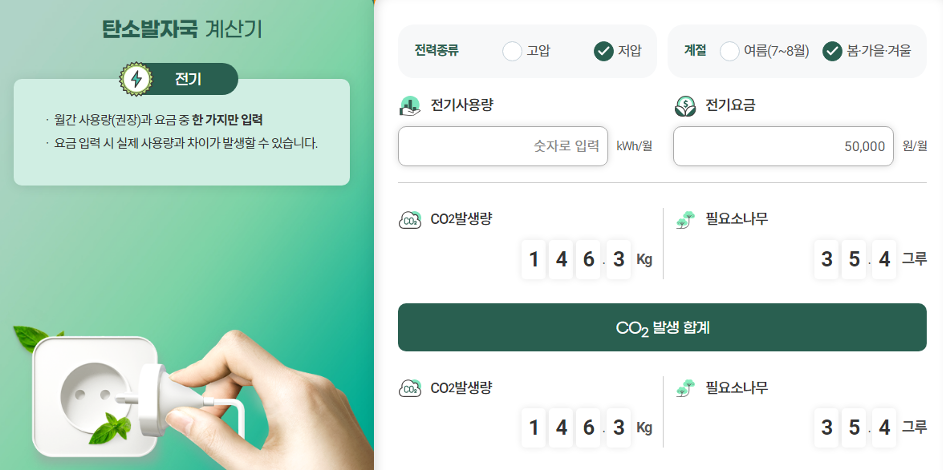 산림청에서도 우리가 배출한 이산화탄소량을 계산하고 이를 흡수하기 위해 심어야 하는 나무 그루 수를 알려주는 ‘탄소나무’ 계산기를 운영 중입니다.