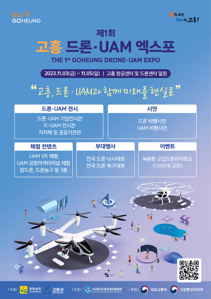 국내외 최신 드론과 UAM(도심형항공교통)의 미래 상용기술까지 한눈에 살펴볼 수 있는 드론·UAM 엑스포가 대한민국 우주항공도시 전남 고흥에서 열린다. 고흥군은 오는 11월3일부터 5일까지 고흥항공센터와 고흥드론센터 일원에서 제1회 고흥 드론·UAM 엑스포(포스터) 행사를 개최한다고 30일 밝혔다. 전남도·고흥군이 공동 주최하고 한국드론산업진흥협회 주관으로 열리는 이번 행사는 미래항공산업의 주도권을 선점하고 미래 100년을 내다본 지역의 먹거리 산업 생태계 조성을 가속화하기 위해 마련됐다.