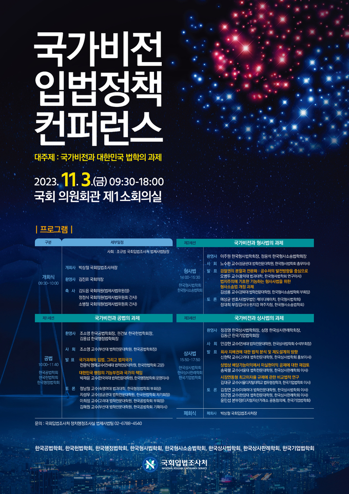 한편, 이번 컨퍼런스는 '국가비전 입법정책 컨퍼런스'의 정례화를 목표로 한 시범사업으로, 향후 국회와 전 분야 법학학술단체 간 합동 학술교류를 촉진하는 연례 컨퍼런스 행사로 확대 추진할 예정이다.