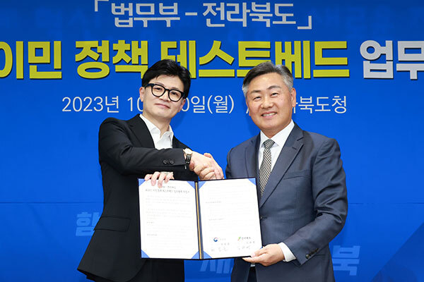 한동훈 법무부 장관은 30일 전북도청을 찾아 김관영 전북지사와 ‘외국인‧이민정책 테스트베드(시험대) 업무협약’을 체결하고 새로운 외국인 이민 정책을 통해 지방 소멸 위기에 공동 대응하기로 했다.